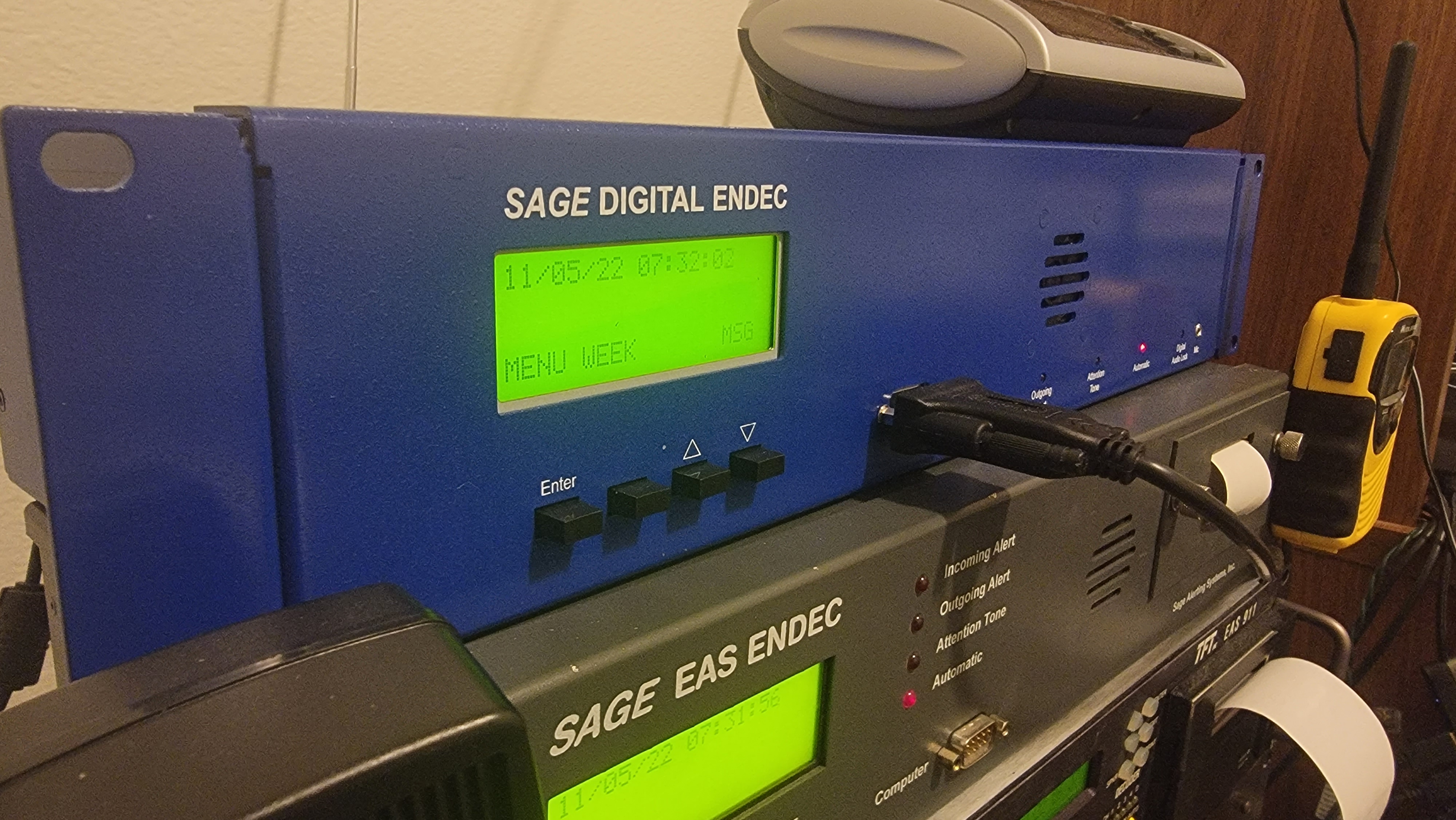 The secondary encoder I have is a Sage EAS Endec 1822 (The Original Grey Box). I acquired this unit on April 13, 2022 from KHWG in Fallon, Nevada. This was the main endec KEVN was using for quite some time. Monitors are currently not in use. Included with the unit was also the Sage EAS Endec Remote Software, which might be used on the Sage Digital instead.