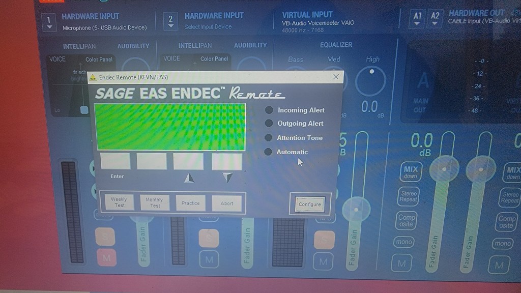 The Sage Digital Endec is the main encoder/decoder that we are currently using. This unit is CAP Compliant and has the latest firmware update which is FPGA version 54, Revision 95 (Rev 95), CR-Rev6, P4 configuration as of July 2, 2021. This unit was acquired on October 18, 2022. I can control it via front panel, special software or the web interface. The Monitor sources are as follows:
